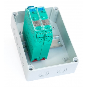 Kapsling komplett med DIN-skena för montering av EX-moduler. Rymmer 1-4 st EX-moduler av typen galvaniska isolatorer och barriärer. Ex-moduler och kabelförskruvningar ingår ej i leveransen.
