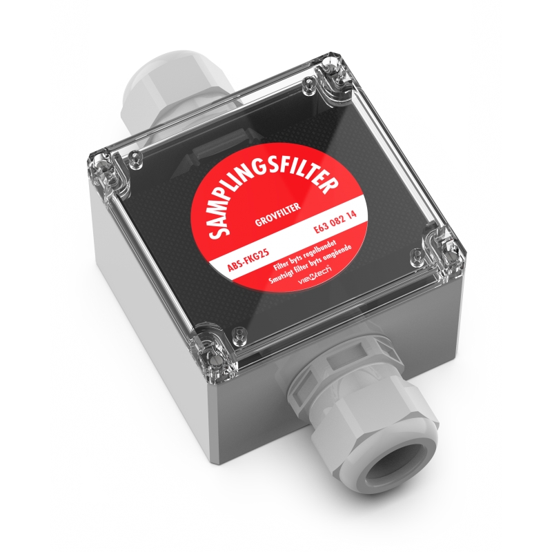 Grovfilter i samplingsanläggningar är nödvändiga för att filtrera bort större partiklar som finns i luften. Denna förstafiltrering minskar radikalt underhållskostnaderna för samplingssystemet då de dyrbara systemfilterna inte behöver bytas ut lika ofta. Filterboxen har två muffar för anslutning av samplingsrör med diameter 25 mm eller 1”. Boxen har ett transparent lock för visuell besiktning av filtret. Filtret kan enkelt bytas mot nytt.