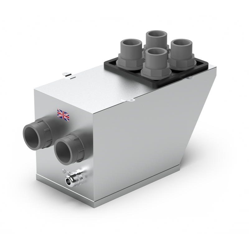 ATECO värmare för samplingssystem där omgivningstemperaturen är under noll grader i samplingsområdet. Värmaren placeras utanför det kalla utrymmet i direkt anslutning till insugningsröret för att undvika kondensbildning. På detta sätt skyddas detektorn från fukt och kyla. Värmaren har 4 insugningsrör från samplingsområdet och 2 utblåsningsrör till detektorn. Luften blandas i värmaren.