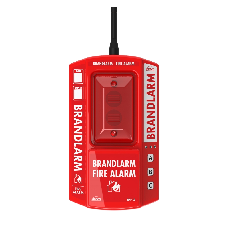 TMP-SB är ett trådlöst kombinerat larmdon (siren / blixt) som tillhör TMP-Serien för Trådlösa bygglarm. Enheten är en av de 250 olika adresserbara enheter som kan kopplas ihop trådlöst i ett system. När enheten aktiveras med annan larmknapp eller om brand detekteras via TMP rök eller värmedetektorer så ljuder 108 dB siren och en stark LED-blixt aktiveras. När allt är kopplat kan basstationen eller vilken enhet som helst som har larmknapp användas för att göra en reset på systemet.